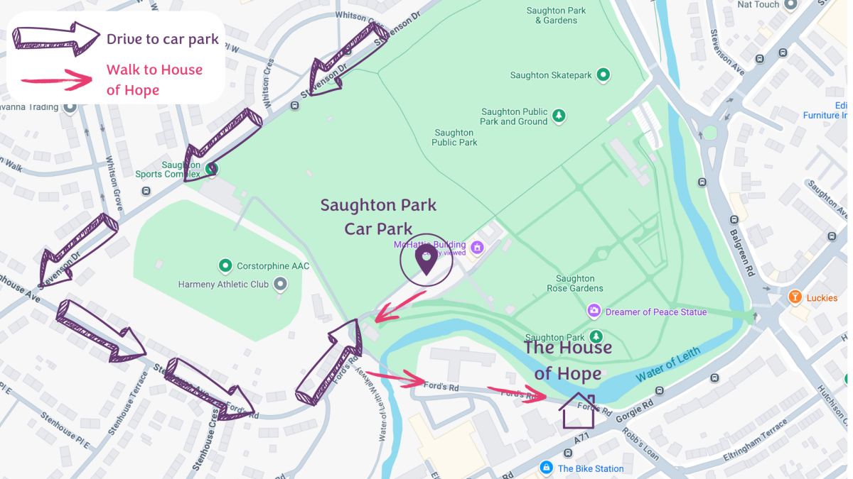 Directions to drive to the car park in Saughton Park, then walk back along Ford's Road to The House of Hope